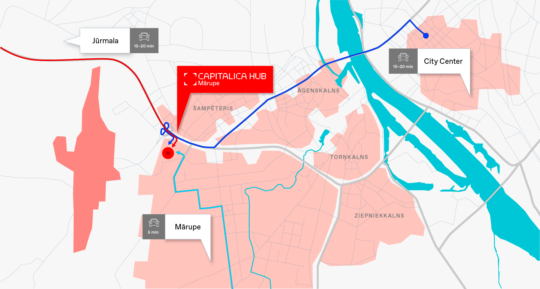 Capitalica HUB Mārupe offers commercial space rental at the beginning of Mārupe – in an excellent location near K. Ulmaņa Gatve, one of Rīga’s main highways. Convenient access to the capital’s city center, the airport, and strategic roads ensures efficient logistics and business mobility.